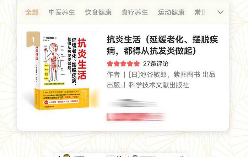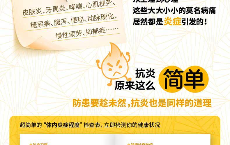 畅销书《抗炎生活》作者池谷敏郎年龄58岁,可血管年龄只有28岁,体脂率也只有10%。他结合多年从医经验和亲身经历,总结出养护血管的医学“返老还童”法,涵盖“止老饮食”“止老运动”“止老习惯”三个方面,所涉及的细节包括减糖、吃饭顺序、坐姿管理、饭后运动、口腔护理及化妆等,面面俱到,手把手教人如何抗老。不需要太辛苦,也不需要昂贵的化妆品和美容整形,只要每天孜孜不倦地践行健康的生活方式,衰老是可以阻止的。