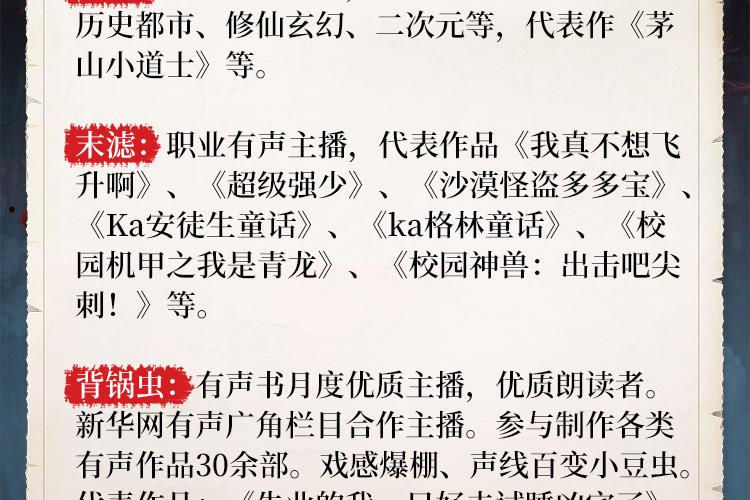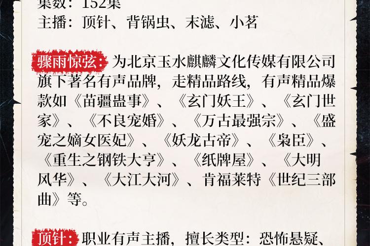 骤雨惊弦:为北京玉水麒麟文化传媒有限公司旗下著名有声品牌,走精品路线,有声精品爆款如《苗疆蛊事》、《玄门妖王》、《玄门世家》、《不良宠婚》、《万古最强宗》、《盛宠之嫡女医妃》、《妖龙古帝》、《枭臣》、《重生之钢铁大亨》、《纸牌屋》、《大明风华》、《大江大河》、肯福莱特《世纪三部曲》等。 顶针:职业有声主播,擅长类型:恐怖悬疑、历史都市、修仙玄幻、二次元等,代表作《茅山小道士》等 末滤:职业有声主播,代表作品《我真不想飞升啊》、《超级强少》、《沙漠怪盗多多宝》、《Ka安徒生童话》、《ka格林童话》、《校园机甲之我是青龙》、《校园神兽:出击吧尖刺!》等 背锅虫:优质主播,优质朗读者。新华网有声广角栏目合作主播。参与制作各类有声作品30余部。戏感爆棚、声线百变小豆虫。代表作品:《失业的我,只好去试睡凶宅了》、《ka格林童话》、《怪兽镇大战巫师僵尸》等 小茗:全声线女播,擅长少御,御姐,代表作《天字第一当》《我有一剑》等