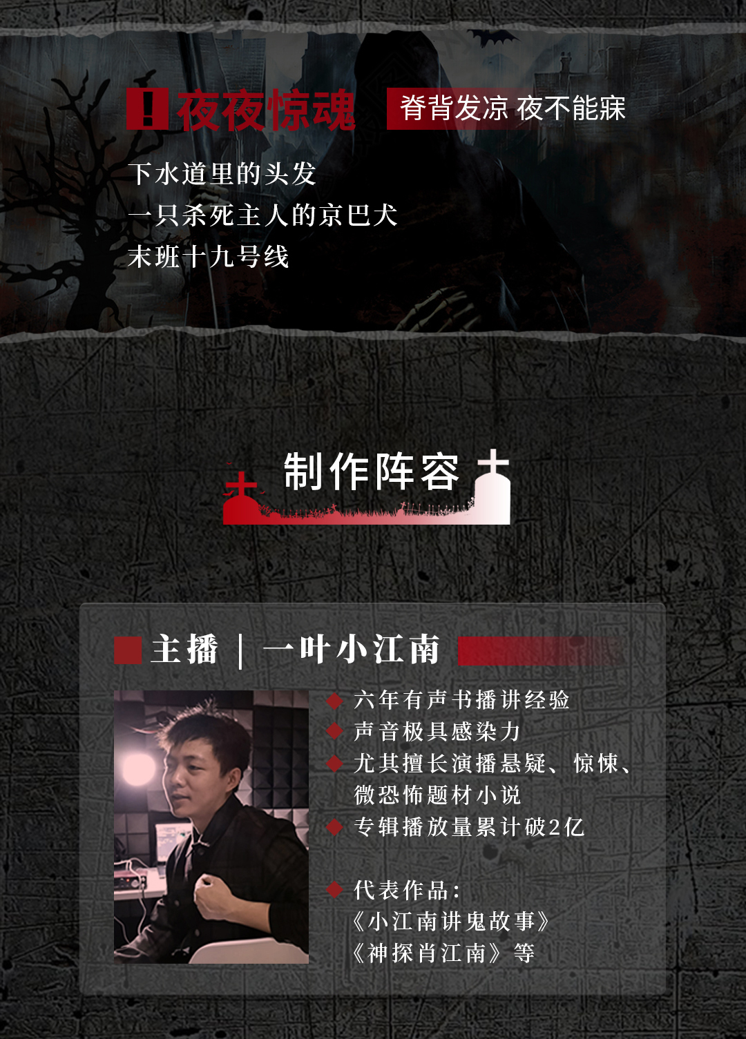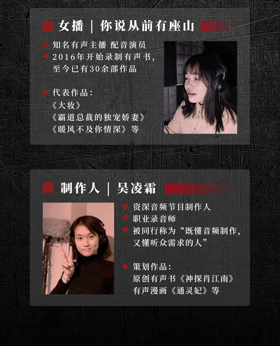 一个以有声读物为核心的原创内容团队。目前主要开发的题材是:悬疑、刑侦、恐怖、灵异等……
