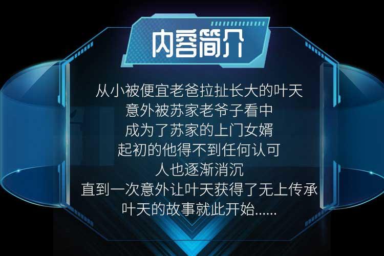 从小被便宜老爸拉扯长大的叶天,意外被苏家老爷子看中,成为了苏家的上门女婿,起初的他得不到任何认可,人也逐渐消沉,直到一次意外让叶天获得了无上传承,叶天的故事就此开始......