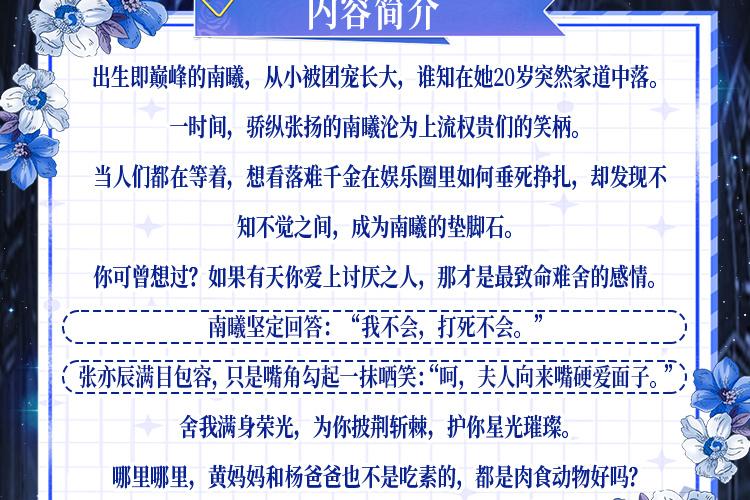 故事简介【事业感情两手抓,主角双强】  出生即巅峰的南曦,从小被团宠长大,谁知在她20岁突然家道中落。   一时间,骄纵张扬的南曦沦为上流权贵们的笑柄。   当人们都在等着,想看落难千金在娱乐圈里如何垂死挣扎,却发现不知不觉之间,成为南曦的垫脚石。   你可曾想过?如果有天你爱上讨厌之人,那才是最致命难舍的感情。   南曦坚定回答:“我不会,打死不会。”   张亦辰满目包容,只是嘴角勾起一抹哂笑:“呵,夫人向来嘴硬爱面子。”舍我满身荣光,为你披荆斩棘,护你星光璀璨。 哪里哪里,黄妈妈和杨爸爸也不是吃素的,都是肉食动物好吗