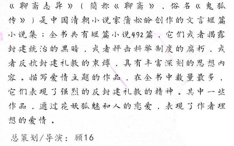 《聊斋志异》(简称《聊斋》,俗名《鬼狐传》)是中国清朝小说家蒲松龄创作的文言短篇小说集;全书共有短篇小说492篇,它们或者揭露封建统治的黑暗,或者抨击科举制度的腐朽,或者反抗封建礼教的束缚,具有丰富深刻的思想内容。描写爱情主题的作品,在全书中数量最多,它们表现了强烈的反封建礼教的精神。其中一些作品,通过花妖狐魅和人的恋爱,表现了作者理想的爱情