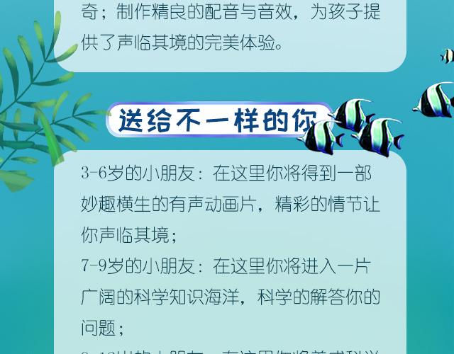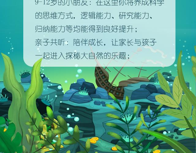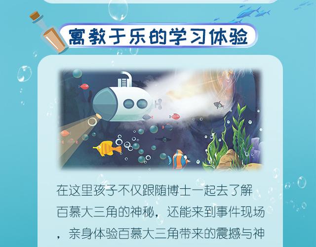 在这里孩子不仅跟随博士一起去了解百慕大三角的神秘,还能来到事件现场亲身体验百慕大三角带来的震撼与神奇,制作精良的配音与音效,为孩子提供了声临其境的完美体验。 3-6岁的小朋友: 在这里你将得到一部妙趣横生的有声动画片,精彩的情节让 你声临其境; 7-9岁的小朋友: 在这里你将进入一片广阔的科学知识海洋,科学的解答你的问题; 9-12岁的小朋友: 在这里你将养成科学的思维方式,逻辑能力、研究能力、归纳能力等均能得到良好提升;亲子共听: 陪伴成长,让家长与孩子一起进入探秘大自然的乐趣: