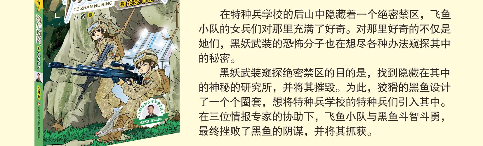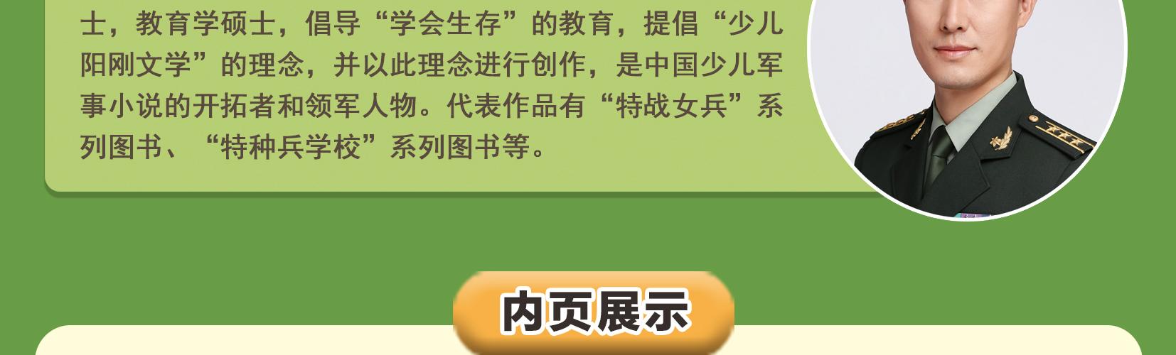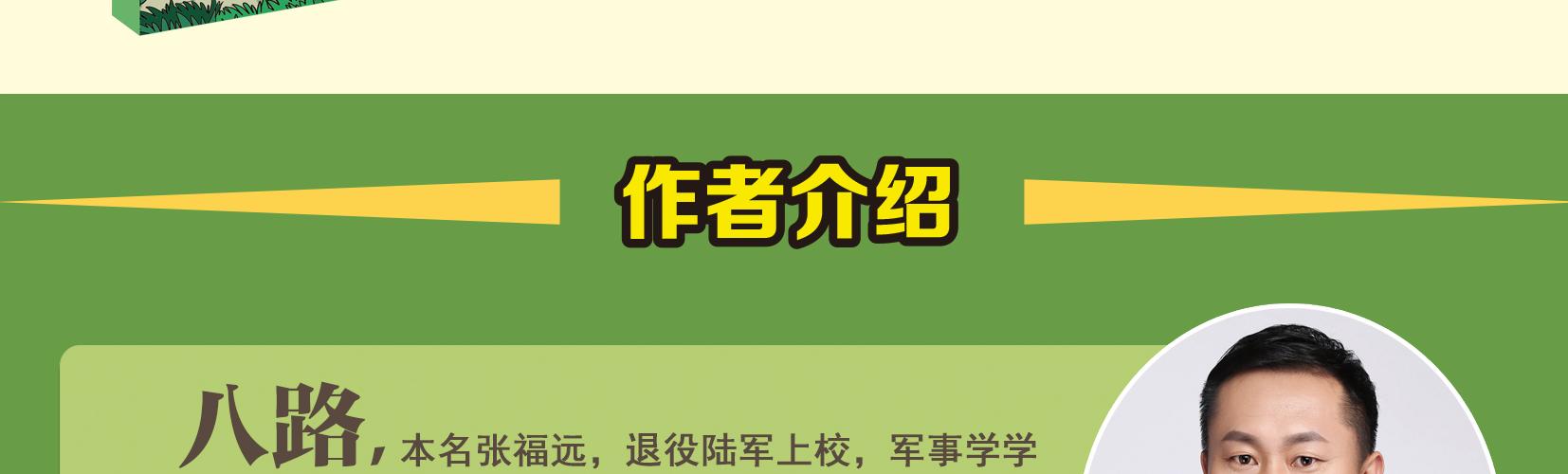 作家八路,军事学学士,教育学硕士,少儿军事文学领军人物,以“学会生存”的理念进行创作,将“知识、技能、品质”三大要素融入到作品之中。曾获军队科技进步二等奖等多项奖励,作品入选“十三五”国家重点出版物出版规划,作品有“特种兵学校”“少年特战队”“会飞的军校”“烈火兵王”等。
