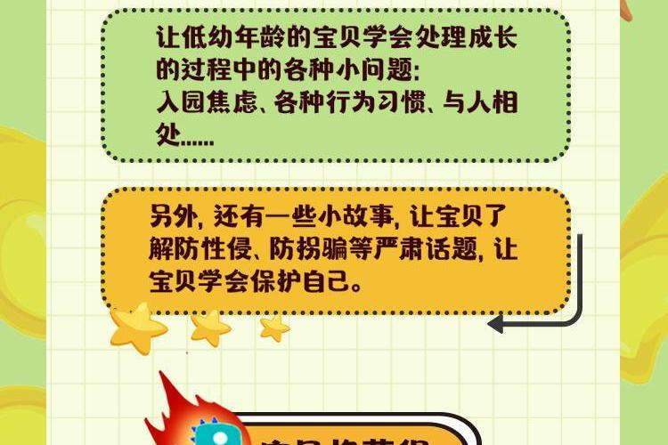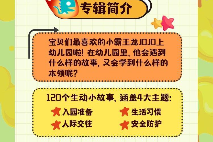 宝贝们最喜欢的小霸王龙上幼儿园啦!在幼儿园里,他会遇到什么样的故事,又会学到什么样的本领呢?120个生动小故事,涵盖4大主题:入园准备生活习惯人际交往安全防护让低幼年龄的宝贝学会处理成长的过程中的各种小问题:入园焦虑、各种行为习惯、与人相处......另外,还有一些小故事,让宝贝防拐骗等严肃话题,让宝贝学会保护自己。