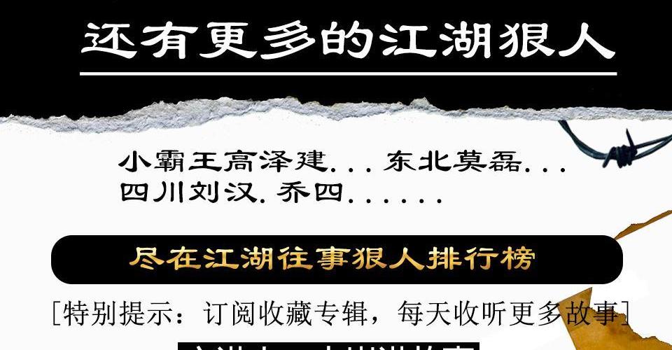 江湖往事:狠人排行榜2023年重磅上线 免费收听 青岛聂磊,京城加代,东北乔四,黑老大刘勇,长春孙世贤...江湖大哥的故事 他们在江湖上曾经搅动一番血雨腥风,他们被人们称为地方一霸,跺一跺脚就会有无数人去领盒饭,虽然他们都已故去,但他们的传说也在江湖中留下了浓墨淡彩的一笔。