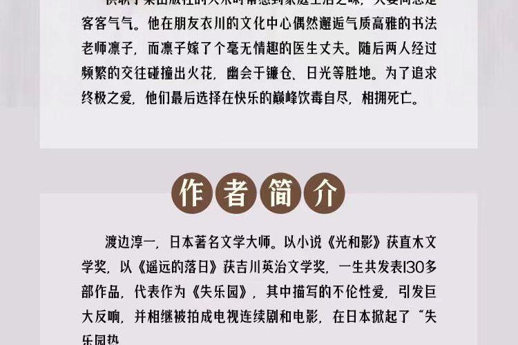 这部小说何以名之为《失乐园》,所失何乐?英国诗人弥尔顿的长诗《失乐园》中,亚当和夏娃由于偷食禁果而失去了伊甸园这个乐园。那么三百多年后的这部作为长篇小说的《失乐园》呢?......不妨说,《失乐园》所失之乐乃是本真生命之乐。其主题乃是对本真生命的一种温情脉脉而又咄咄逼人的叩问与探寻。然而必须说,其所借助的婚外恋这一形式乃是一颗不折不扣的禁果,一颗可能人人想摘而又不敢摘的禁果。毕竟,人之所以为人,情愿也罢不情愿也罢,都必须受制于责任、义务、伦理道德以至法律、体制、意识形态等种种样样的约束。任何社会留给个人“任性”的空间都是有限的。尤其在男女关系这个敏感地带,任何试图颠覆公认的社会规范和世俗价值观而一味追求本真生命存在状态的努力,都注定以悲剧告终。勇气固然可嘉,但行为不可取。这或许也可称为人之所以为人的宿命。 ——林少华 译者序《所失何乐 所得何乐》