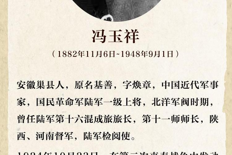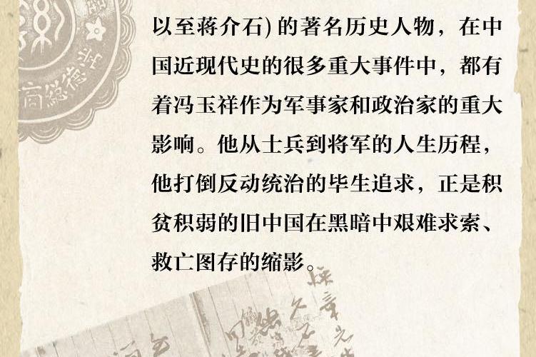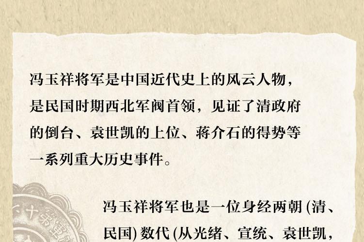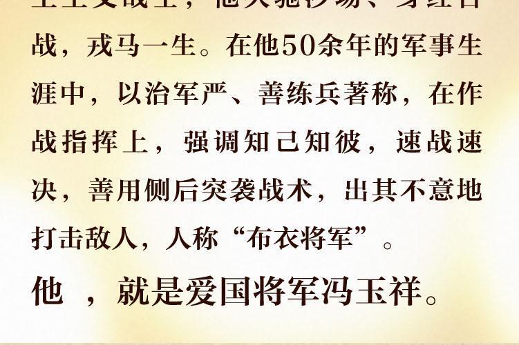 他是中国近代史上的风云人物…… 他是民国时期西北军阀首领…… 他是蒋介石的结拜兄弟…… 他从一个穷苦孩子成长为赫赫有名的一代战将…… 他是一位从旧军人转变成的坚定的民主主义战士,他久驰沙场、身经百战,戎马一生。 在他50余年的军事生涯中,以治军严、善练兵著称,在作战指挥上,强调知己知彼,速战速决,善用侧后突袭战术,出其不意地打击敌人,人称“布衣将军”。 他 ,就是爱国将军冯玉祥。