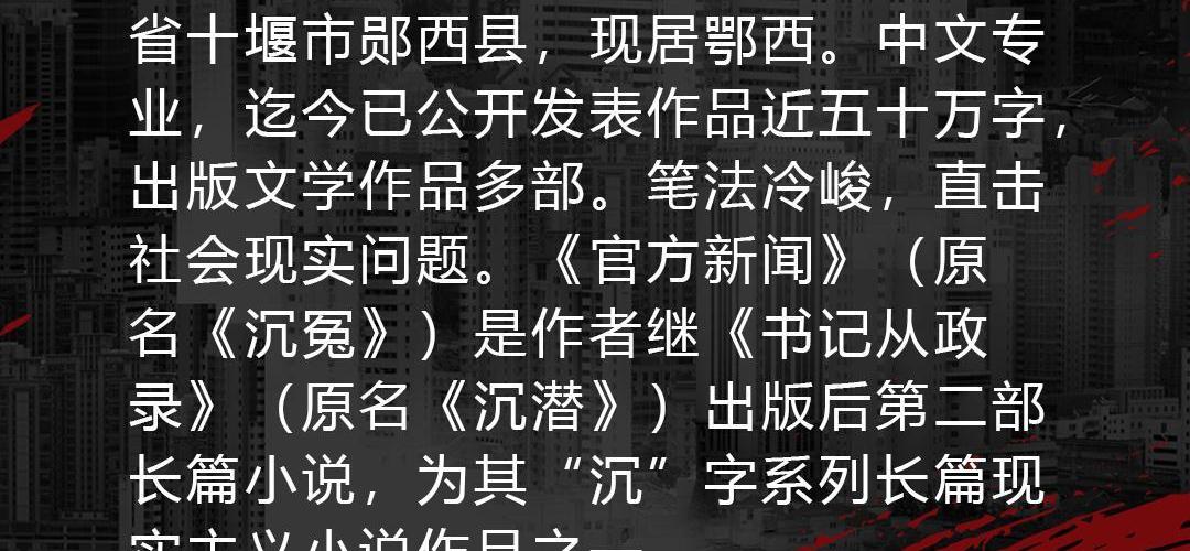 水平高原是重阳市畜牧局一名普通兽医,因新闻写得好,被多家媒体聘为特约记者。一次,他按电视直播复制的一篇反映市委书记政务活动的新闻,阴差阳错上了各大主流媒体的头版头条。由此,他的命运也发生了翻天覆地的变化,在干部公开选拔中以“内定人选”的资格被招进了市委宣传部,从此走上了仕途。 【作者简介】 肖正华,笔名野望,生于湖北省十堰市郧西县,现居鄂西。中文专业,迄今已公开发表作品近五十万字,出版文学作品多部。笔法冷峻,直击社会现实问题。《官方新闻》(原名《沉冤》)是作者继《书记从政录》(原名《沉潜》)出版后第二部长篇小说,为其“沉”字系列长篇现实主义小说作品之一。 【团队介绍】 出品:阅米文化 作者:肖正华 后期:憨憨 审听:晚秋 主播:余阳,薄荷羊肉粉