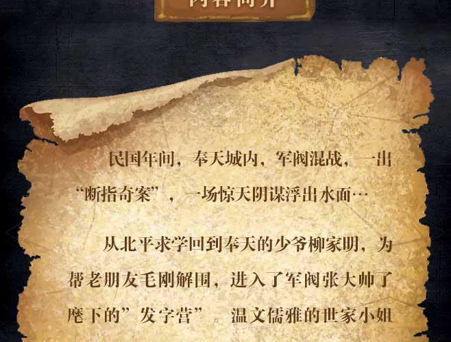 著名演播艺术家周建龙倾情演播,一场扣人心弦的听觉盛宴,带你踏入故事中的世界,感受到前所未有的紧张与刺激。 一出“断指奇案”,一场惊天阴谋,一段时代洪流裹挟下荡气回肠的往事 江湖道义,家国情怀,民族脊梁…… 【内容简介】 民国初年,从北平求学回到奉天的少爷柳家明,无意间卷入了轰动一时的“断指奇案”,为帮老朋友毛刚解围,他进入了军阀张大帅了麾下的”发字营”,开启了一段围绕着几枚神秘戒指的充满重重迷雾和层层陷阱的坎坷故事。 【主播简介】 周建龙:著名话剧编导、导演、演员, 代表作品 话剧:《默默的雪默默的山》获“中国曹禺戏剧奖”导演奖、创作奖和表演奖;全国广播剧一等奖 有声小说:《鬼吹灯》、《盗墓笔记》、《黑道风云二十年》《地底世界》《猎宝天官》、《摸金异闻录》、《寻龙秘藏》等。