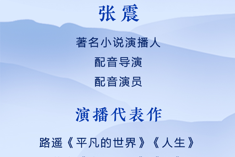 张震 著名小说演播人 配音导演 配音演员 “声之优”艺术总监 演播代表作 路遥《平凡的世界》《人生》 莫言《丰乳肥臀》《蛙》 王小波《黄金时代》 村上春树《刺杀骑士团长》