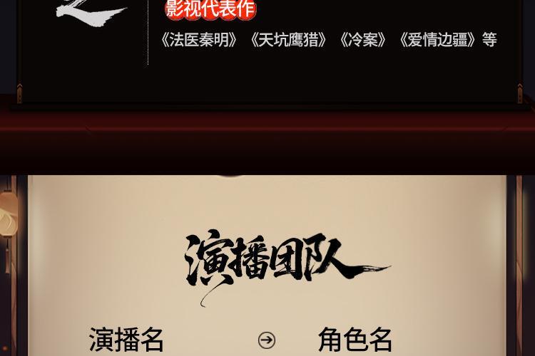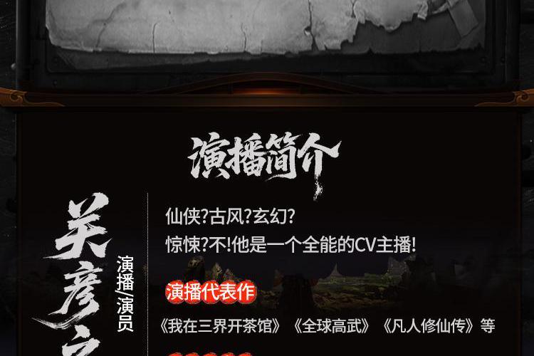 关彦之-演播 /演员 演播代表作:《我在三界开茶馆》《全球高武》《凡人修仙传》等。 影视代表作:《法医秦明》《天坑鹰猎》《冷案》《爱情边疆》等
