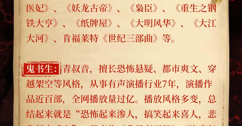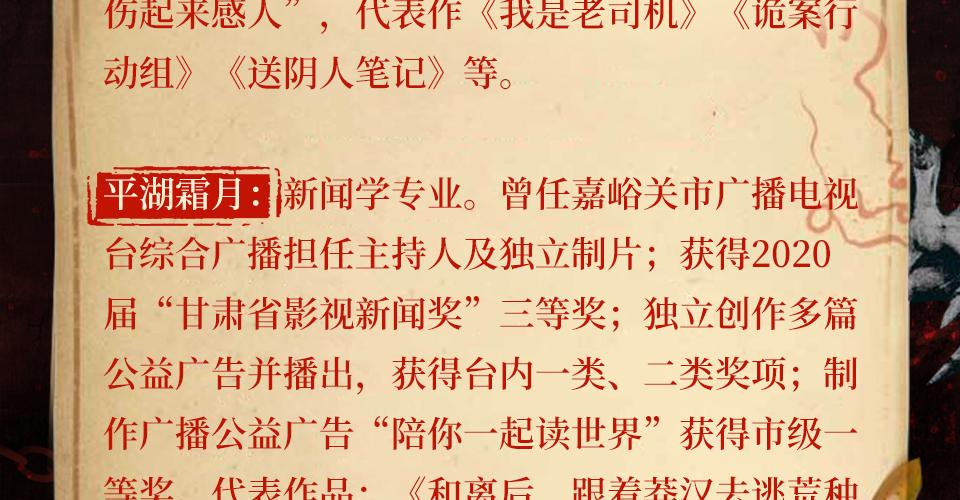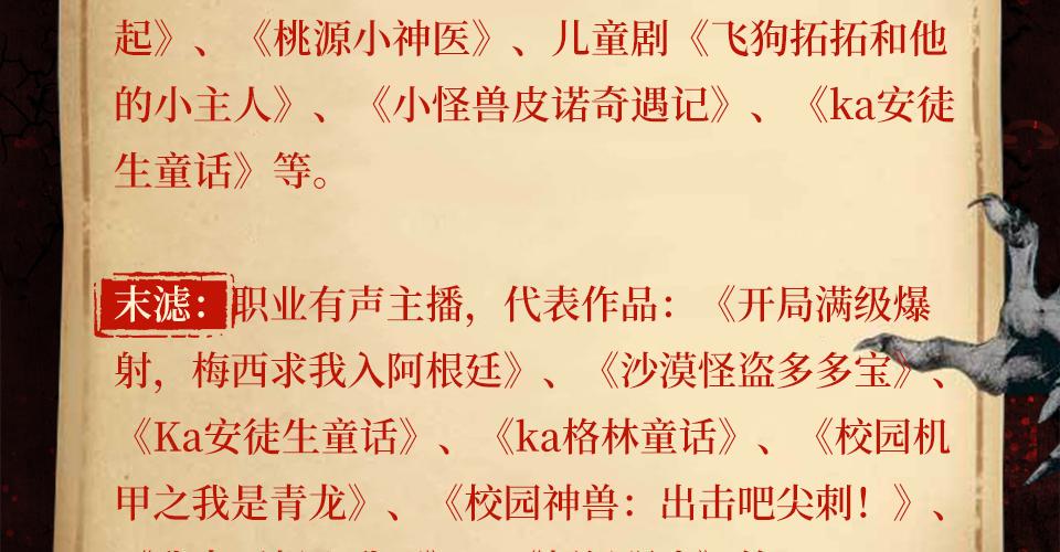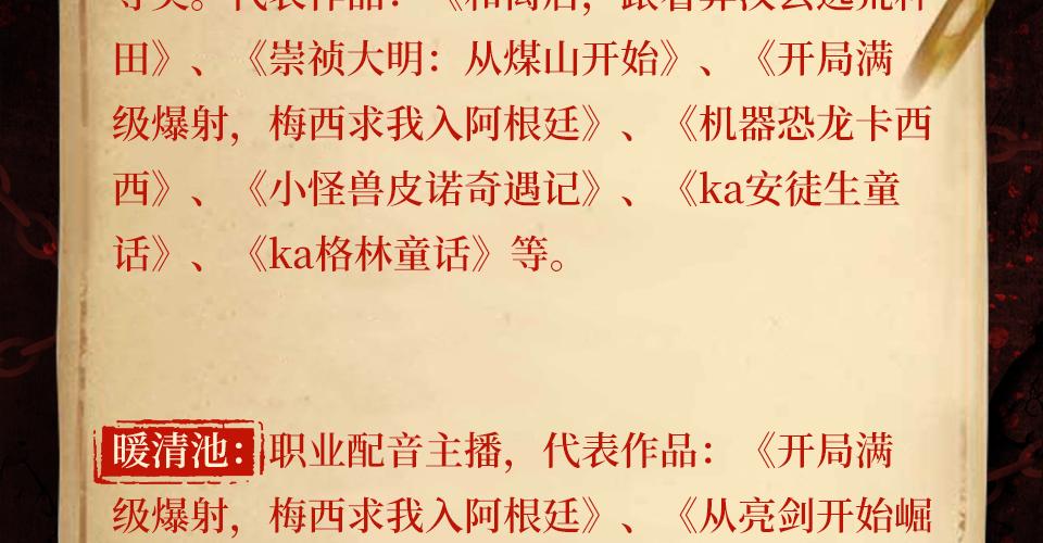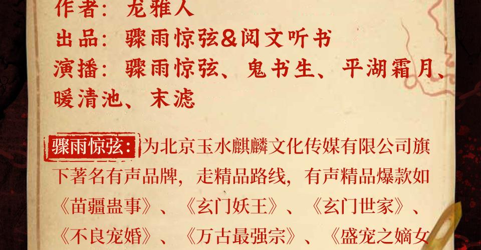 骤雨惊弦:为北京玉水麒麟文化传媒有限公司旗下著名有声品牌,走精品路线,有声精品爆款如《苗疆蛊事》、《玄门妖王》、《玄门世家》、《不良宠婚》、《万古最强宗》、《盛宠之嫡女医妃》、《妖龙古帝》、《枭臣》、《重生之钢铁大亨》、《纸牌屋》、《大明风华》、《大江大河》、肯福莱特《世纪三部曲》等。 鬼书生:青叔音,擅长恐怖悬疑、都市爽文、穿越架空等风格,从事有声演播行业7年,演播作品近百部,全网播放量过亿。播放风格多变,总结起来就是“恐怖起来渗人,搞笑起来喜人,悲伤起来感人”,代表作《我是老司机》《诡案行动组》《送阴人笔记》等。 平湖霜月:新闻学专业。曾任嘉峪关市广播电视台综合广播担任主持人及独立制片;获得2020届“甘肃省影视新闻奖”三等奖;独立创作多篇公益广告并播出,获得台内一类、二类奖项;制作广播公益广告“陪你一起读世界”获得市级一等奖。代表作品:《和离后,跟着莽汉去逃荒种田》、《崇祯大明:从煤山开始》、《开局满级爆射,梅西求我入阿根廷》、《机器恐龙卡西西》、《小怪兽皮诺奇遇记》、《ka安徒生童话》、《ka格林童话》等。 暖清池:职业配音主播,代表作品:《开局满级爆射,梅西求我入阿根廷》、《从亮剑开始崛起》、《桃源小神医》、儿童剧《飞狗拓拓和他的小主人》、《小怪兽皮诺奇遇记》、《ka安徒生童话》等。 末滤:职业有声主播,代表作品:《开局满级爆射,梅西求我入阿根廷》、《沙漠怪盗多多宝》、《Ka安徒生童话》、《ka格林童话》、《校园机甲之我是青龙》、《校园神兽:出击吧尖刺!》、《我真不想飞升啊》、《超级强少》等