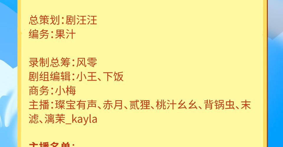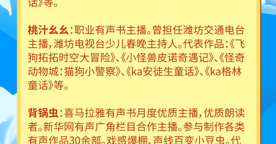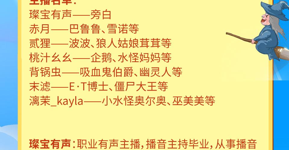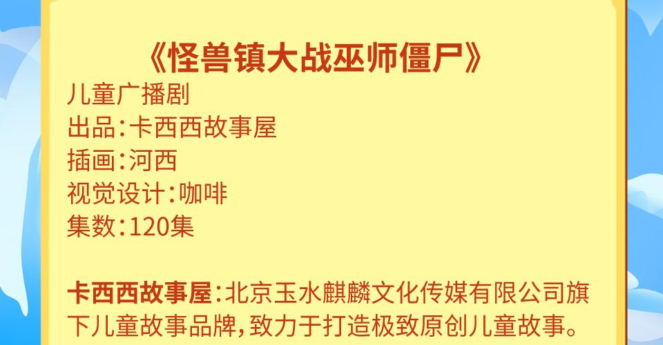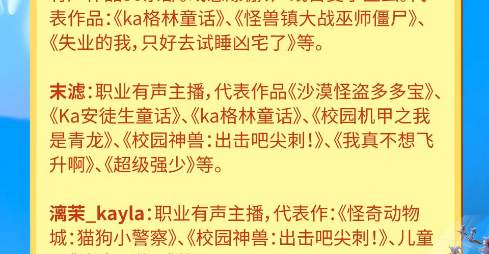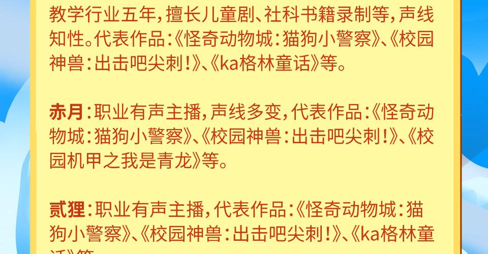 卡西西故事屋:北京玉水麒麟文化传媒有限公司旗下儿童故事品牌,致力于打造极致原创儿童故事。 总策划:剧汪汪 编务:果汁 录制总筹:风零 剧组编辑:小王、下饭 商务:小梅 主播:璨宝有声、赤月、贰狸、桃汁幺幺、背锅虫、末滤、漓茉_kayla 主播名单: 璨宝有声——旁白 赤月——巴鲁鲁、雪诺等 贰狸——波波、狼人姑娘茸茸等 桃汁幺幺——企鹅、水怪妈妈等 背锅虫——吸血鬼伯爵、幽灵人等 末滤——E·T博士、僵尸大王等 漓茉_kayla——小水怪奥尔奥、巫美美等 璨宝有声:职业有声主播,播音主持毕业,从事播音教学行业五年,擅长儿童剧、社科书籍录制等,声线知性。代表作品:《怪奇动物城:猫狗小警察》、《校园神兽:出击吧尖刺!》、《ka格林童话》等 赤月:职业有声主播,声线多变,代表作品:《怪奇动物城:猫狗小警察》、《校园神兽:出击吧尖刺!》、《校园机甲之我是青龙》等 贰狸,职业有声主播,代表作品:《怪奇动物城:猫狗小警察》、《校园神兽:出击吧尖刺!》、《ka格林童话》等 桃汁幺幺:职业有声书主播。曾担任潍坊交通电台主播,潍坊电视台少儿春晚主持人。代表作品:《飞狗拓拓时空大冒险》、《小怪兽皮诺奇遇记》、《怪奇动物城:猫狗小警察》、《ka安徒生童话》、《ka格林童话》等。 背锅虫,喜马拉雅有声书月度优质主播,优质朗读者。新华网有声广角栏目合作主播。参与制作各类有声作品30余部。戏感爆棚、声线百变小豆虫。代表作品:《ka格林童话》、《怪兽镇大战巫师僵尸》、《失业的我,只好去试睡凶宅了》等 末滤:职业有声主播,代表作品《沙漠怪盗多多宝》、《Ka安徒生童话》、《ka格林童话》、《校园机甲之我是青龙》、《校园神兽:出击吧尖刺!》、《我真不想飞升啊》、《超级强少》等 漓茉_kayla:职业有声主播,代表作:《怪奇动物城:猫狗小警察》、《校园神兽:出击吧尖刺!》、儿童剧《地球环游记》等