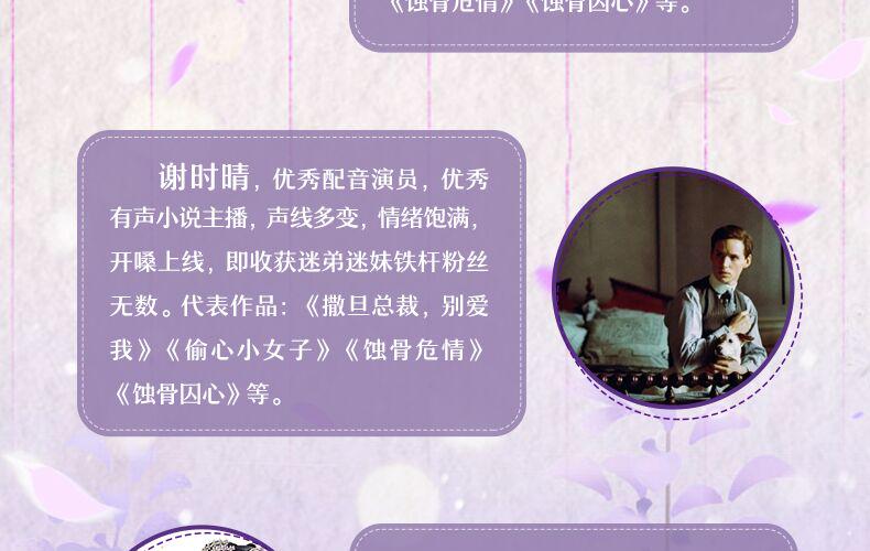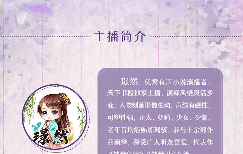 "璟然,优秀有声小说演播者,天下书盟独家主播,演绎风格灵活多变,人物刻画形像生动,声线有磁性,可塑性强,正太、萝莉、少女、少御、老年音均能熟练驾驭,参与十余部作品演绎,深受广大听友喜爱,代表作《蚀骨危情》《蚀骨囚心》等。 谢时晴,优秀配音演员,优秀有声小说主播,声线多变,情绪饱满,开嗓上线,即收获迷弟迷妹铁杆粉丝无数。代表作品:《撒旦总裁,别爱我》《偷心小女子》《蚀骨危情》《蚀骨囚心》 火柴,实力派有声书演播者,全年龄声线,角色塑造真情实感,声音上线后深受广大听众的喜爱,代表作:《念念不相忘》等 。"