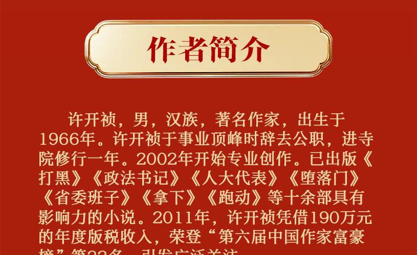 【内容简介】 《打黑》是许开祯所著一部官场小说。黑色遮住的是阳光和色彩,黑社会蒙蔽的是正义和良知。沉渣泛起,群魔乱舞,穷凶极恶,血雨腥风。丧失了人性尊严的黑恶势力,不仅让善良弱小的人们承受苦难,也无时无刻不腐蚀着社会准则与国家利益。当我们惊恐于黑势力的泛滥时,是否想过那些潜藏在罪恶背后的权力“保护伞”和道貌岸然的官场蠢虫?黑白两道张丝结网、狼狈为奸,他们才是社真正的毒瘤。在与黑恶势力的殊死较量中,正义虽终将彰显,但过程注定充满劫难。这是勇气和智慧的较量,也是人性善恶的抗争。在贪婪和欲望的蛊惑下,黑恶势力又怎肯善罢甘休? 【作者简介】 许开祯,男,汉族,著名作家,出生于1966年。许开祯于事业顶峰时辞去公职,进寺院修行一年。2002年开始专业创作。已出版《打黑》《政法书记》《人大代表》《堕落门》《省委班子》《拿下》《跑动》等十余部具有影响力的小说。 【制作团队】 出品:阅米文化 作者:许开祯 画本:靖靖 审听:言霁 美工:木折 演播:意声无忧、茶香酒淡、豆包、Cv巫女、苏摩