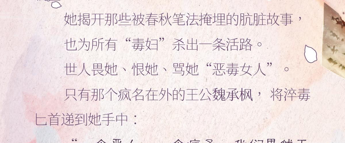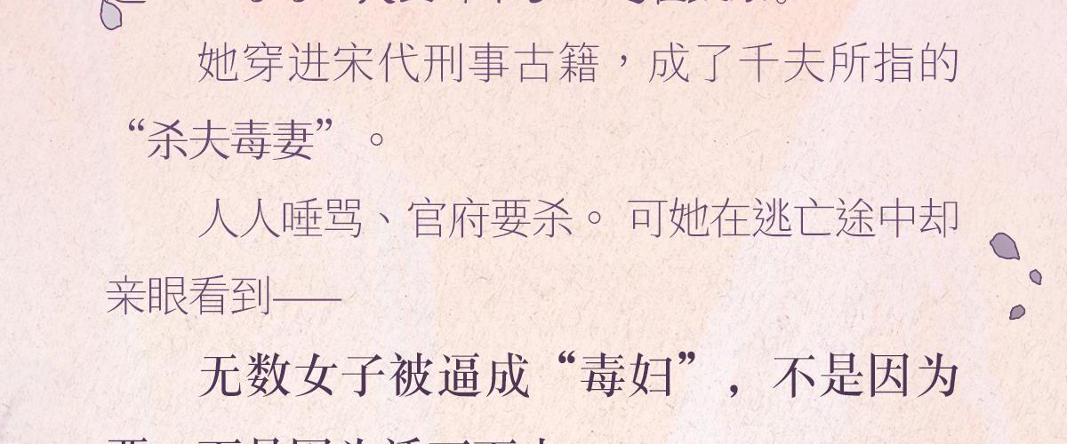 【古言穿书·大女主爽文·双强博弈】 “穿越成杀夫毒妇,她靠“偷奸”活了下来” 古籍修复师师屏画,一场车祸穿进了宋代刑事案卷里,成了那个被千刀万剐的“杀夫毒妻”。 婆家要她死,娘家一夜崩塌,连贴身丫鬟都当堂指认她偷奸。 绝境中,她随口编了个“权贵奸夫”保命。 没想到,那位被拉下水的疯王公当真找上了门。 一个恶女,一个疯子。他递给她淬毒的匕首:“我们果然是天造地设的一对。” 七个杀夫案,七个被逼成“毒妇”的女人,她为她们沉冤昭雪,也为所有“毒妇”杀出一条血路。 听《毒妻》,看宋代致命女人如何绝地反击。