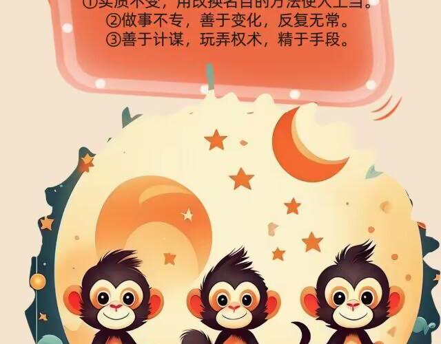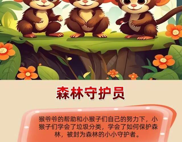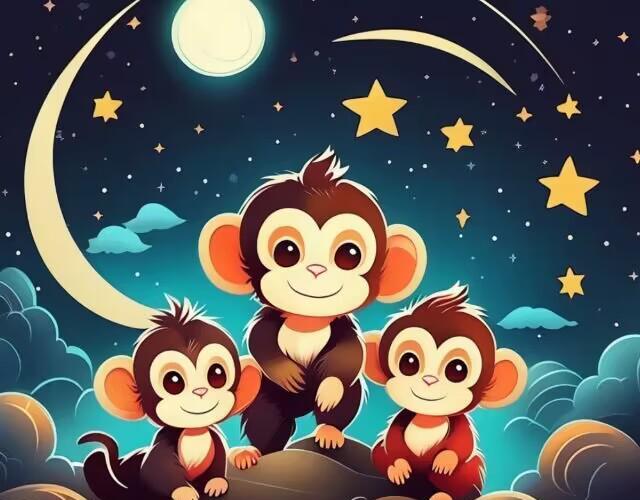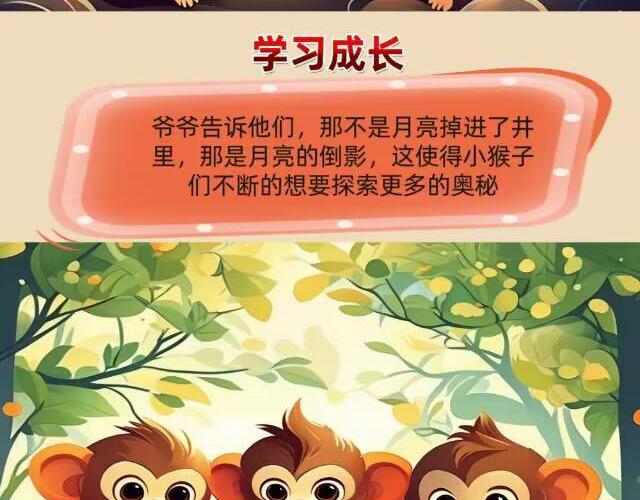 在这片神奇的森林中,三只小猴子淘淘、乖乖和田田,通过一系列既幽默又寓意深刻的冒险,从最初的淘气和无知,逐渐成长为森林中的小英雄。故事巧妙地融合了中国古代成语“朝三暮四”和经典寓言“猴子捞月”,展现了小猴子们对数字和现实认知的天真误解,以及他们对月亮倒影的好奇和惊慌。
