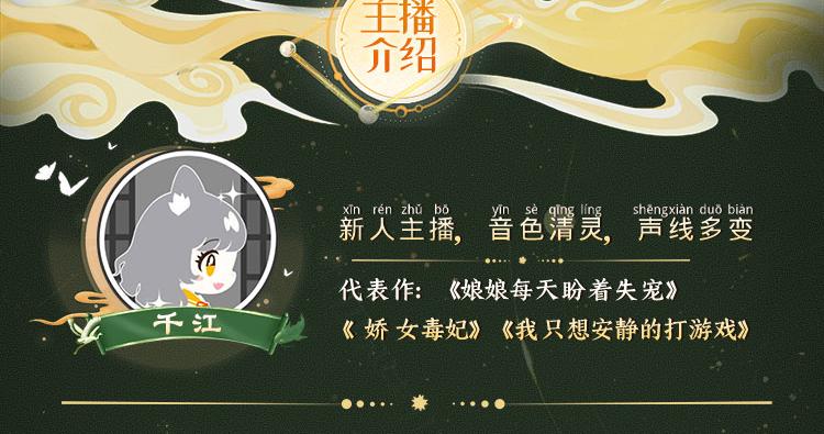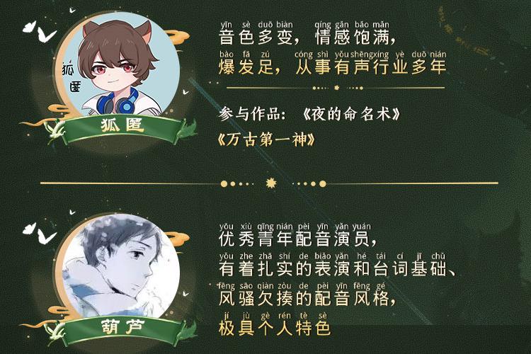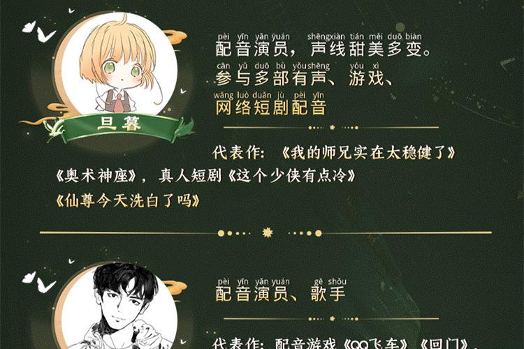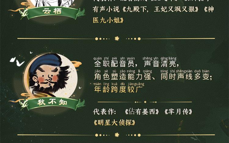千江:新人主播,音色清灵,声线多变;代表作:《娘娘每天盼着失宠》《娇女毒妃》《我只想安静的打游戏》 旦暮:配音演员,声线甜美多变。参与多部有声、游戏、网络短剧配音。代表作:《我的师兄实在太稳健了》《奥术神座》,真人短剧《这个少侠有点冷》《仙尊今天洗白了吗》 云栖:配音演员、歌手,代表作:配音游戏《QQ飞车》《回门》,有声小说《九殿下,王妃又飒又狠》《神医九小姐》 秋不知:全职配音员,声音清亮,角色塑造能力强、同时声线多变;年龄跨度较广;代表作: 《佔有姜西》《芈月传》《明星大侦探》 狐匿:音色多变,情感饱满,爆发足,从事有声行业多年;参与作品:《夜的命名术》《万古第一神》 葫芦:优秀青年配音演员,有着扎实的表演和台词基础、风骚欠揍的配音风格,极具个人特色。代表作《有匪》广播剧《撒野》第三季