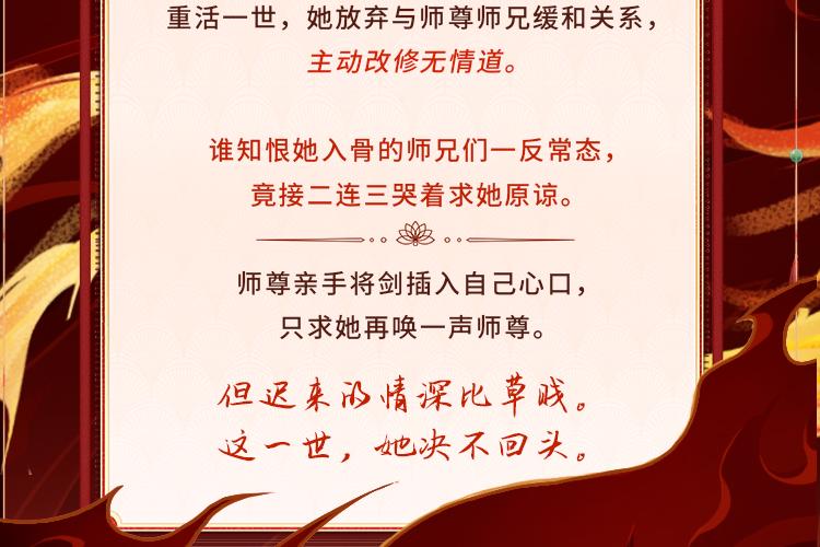 前世,虞昭为了挽回师尊和五位师兄的喜爱,与叶从心斗了一辈子,最后沦为人人喊打的叛徒,被敬爱的师尊亲手刺死。 重活一世,她放弃与师尊师兄缓和关系,主动改修无情道。 谁知恨她入骨的师兄们一反常态,竟接二连三哭着求她原谅。 师尊亲手将剑插入自己心口,只求她再唤一声师尊。 但迟来的情深比草贱。 这一世,她决不回头。