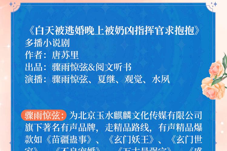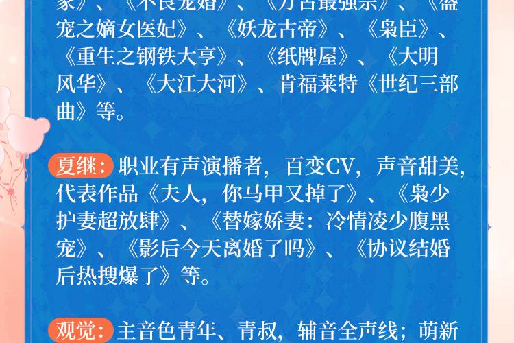 骤雨惊弦:为北京玉水麒麟文化传媒有限公司旗下著名有声品牌,走精品路线,有声精品爆款如《苗疆蛊事》、《玄门妖王》、《玄门世家》、《不良宠婚》、《万古最强宗》、《盛宠之嫡女医妃》、《妖龙古帝》、《枭臣》、《重生之钢铁大亨》、《纸牌屋》、《大明风华》、《大江大河》、肯福莱特《世纪三部曲》等。 夏继:职业有声演播者,百变CV,声音甜美,代表作品《夫人,你马甲又掉了》、《枭少护妻超放肆》、《替嫁娇妻:冷情凌少腹黑宠》、《影后今天离婚了吗》、《协议结婚后热搜爆了》等。