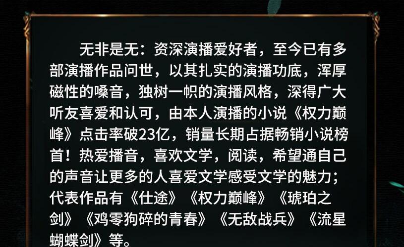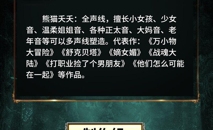 无非是无:资深演播爱好者,演播风格独树一帜,由本人演播的小说《权力巅峰》点击率破23亿。 熊猫夭夭:全声线,擅长各种角色塑造。