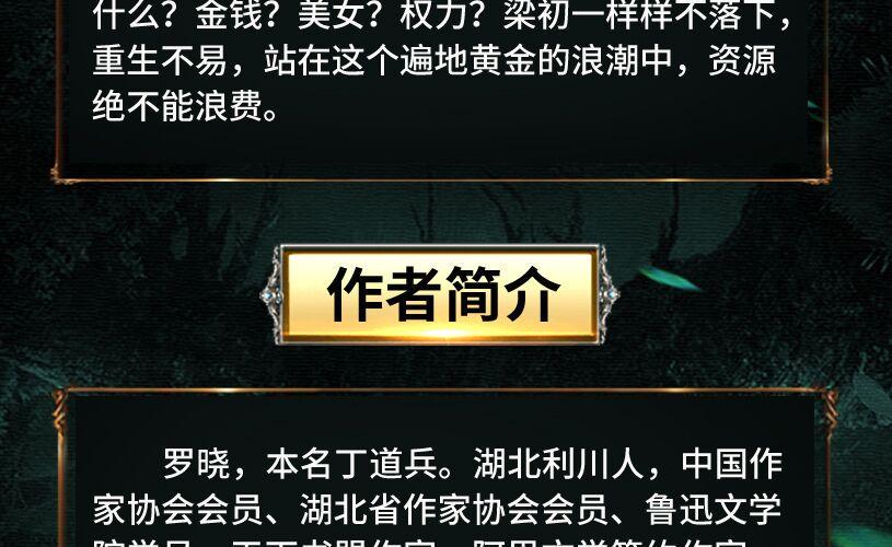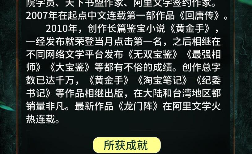 罗晓:2010年,创作长篇鉴宝小说《黄金手》,一经发布就荣登当月点击第一名,之后相继在不同网络文学平台发布《最强相师》《大宝鉴》等都有不俗的成绩,创作总字数已达千万。