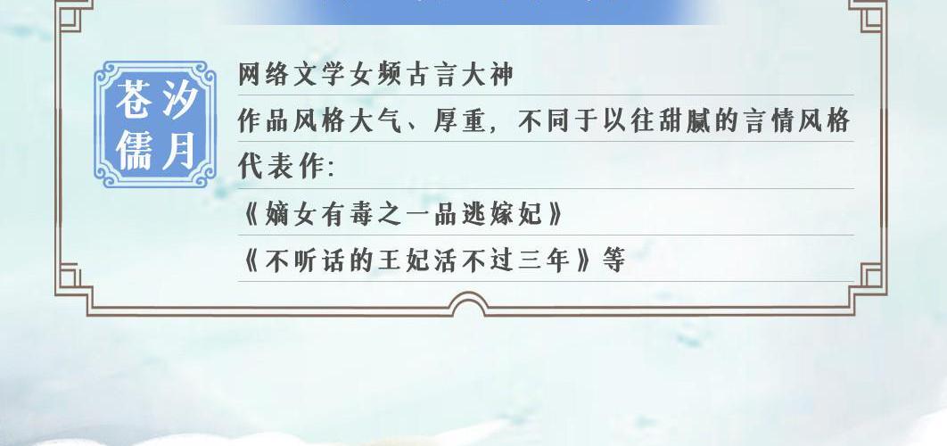 苍汐儒月,网络文学女频古言大神,作品风格大气、厚重,不同于以往甜腻的言情风格,代表作有《不听话的王妃活不过三年》《嫡女有毒之一品逃嫁妃》《大器婉承,夫君请节制》等。