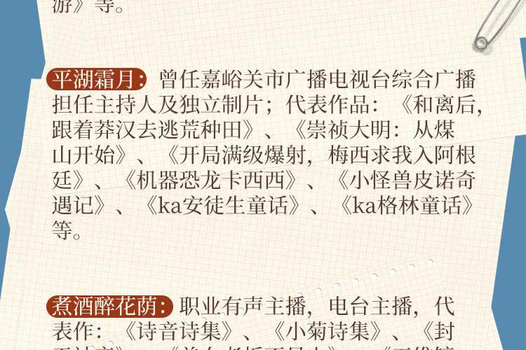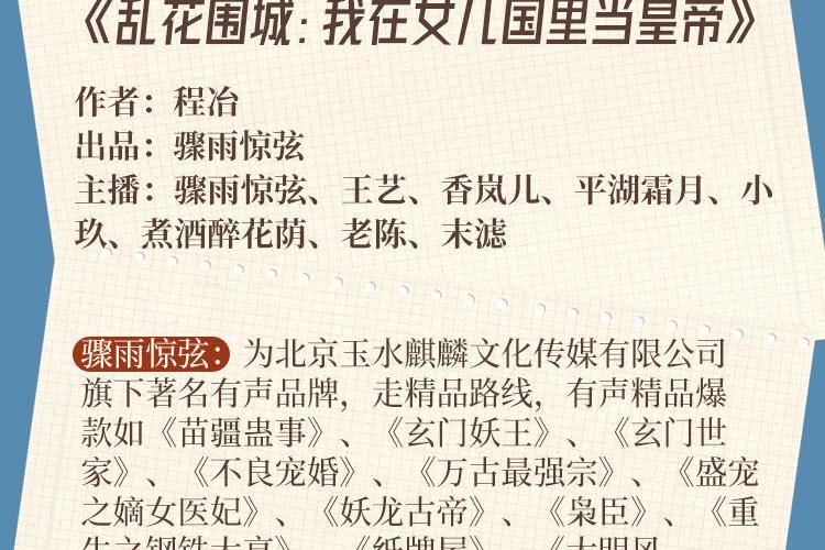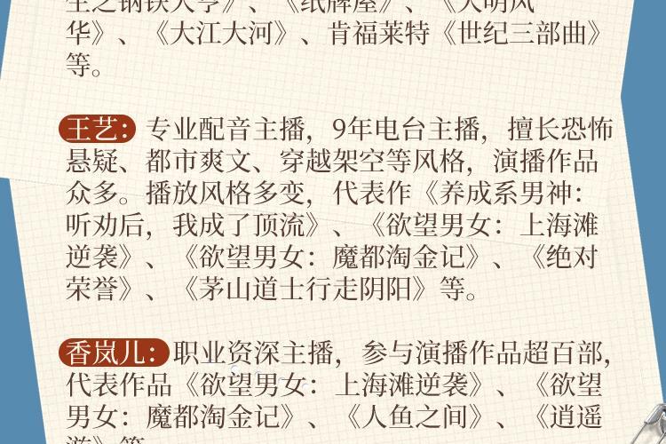 有声精品爆款如《苗疆蛊事》、《玄门妖王》、《玄门世家》、《不良宠婚》、《万古最强宗》、《盛宠之嫡女医妃》、《妖龙古帝》、《枭臣》、《重生之钢铁大亨》、《纸牌屋》、《大明风华》、《大江大河》、肯福莱特《世纪三部曲》等。