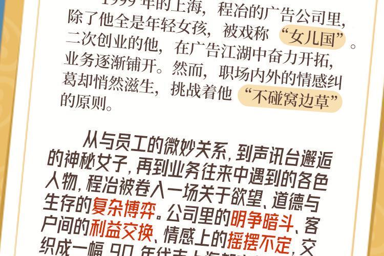 1999 年的上海,程冶的广告公司里,除了他全是年轻女孩,被戏称 “女儿国”。二次创业的他,在广告江湖中奋力开拓,业务逐渐铺开。然而,职场内外的情感纠葛却悄然滋生,挑战着他 “不碰窝边草” 的原则。 从与员工的微妙关系,到声讯台邂逅的神秘女子,再到业务往来中遇到的各色人物,程冶被卷入一场关于欲望、道德与生存的复杂博弈。公司里的明争暗斗、客户间的利益交换、情感上的摇摆不定,交织成一幅 90 年代末上海都市的众生相。在时代的浪潮下,他能否坚守初心,在乱花渐欲的围城中找到属于自己的方向?