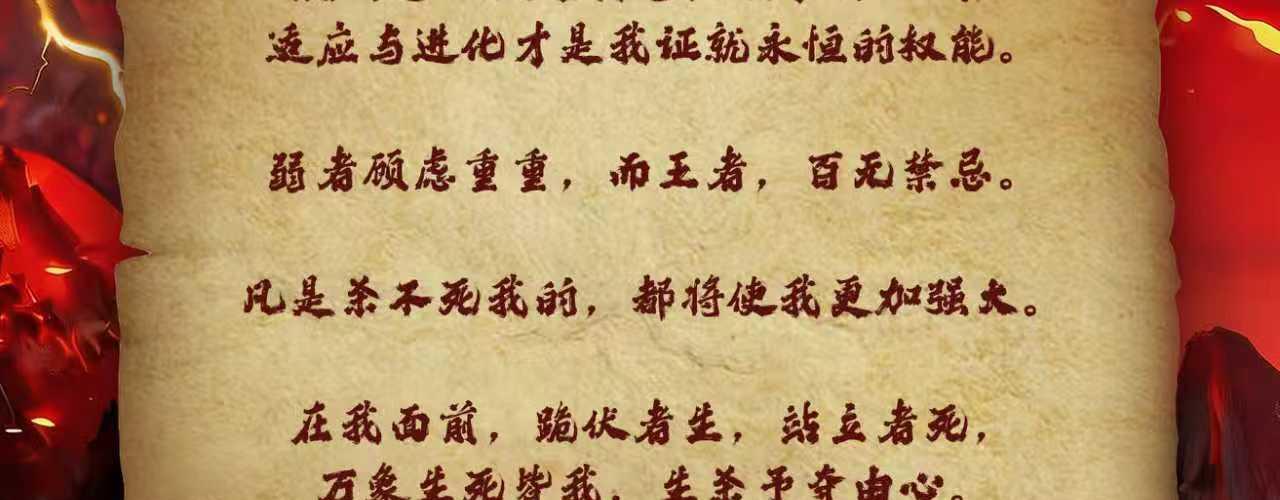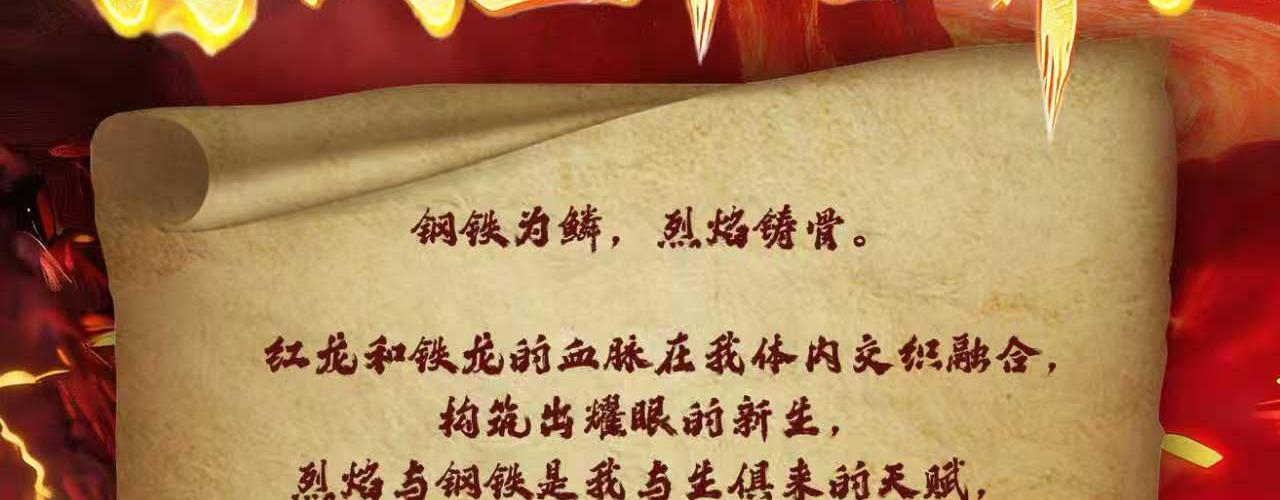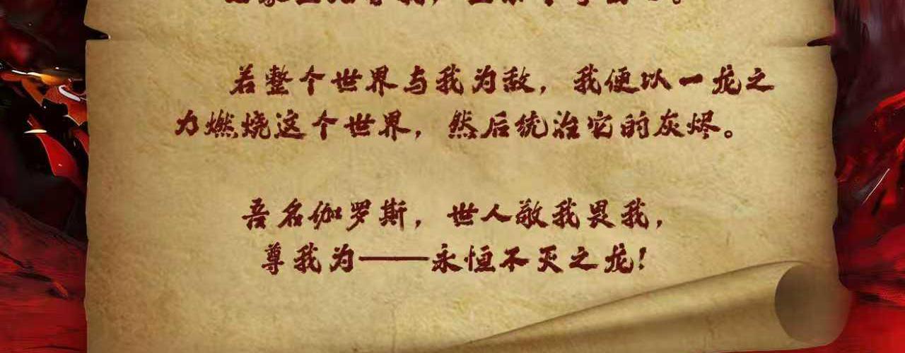 钢铁为鳞,烈焰铸骨。红龙和铁龙的血脉在我体内交织融合,构筑出耀眼的新生,烈焰与钢铁是我与生俱来的天赋,适应与进化才是我证就永恒的权能。弱者顾虑重重,而王者,百无禁忌。凡是杀不死我的,都将使我更加强大。在我面前,跪伏者生,站立者死,万象生死皆我,生杀予夺由心。若整个世界与我为敌,我便以一龙之力燃烧这个世界,然后统治它的灰烬。吾名伽罗斯,世人敬我畏我,尊我为——永恒不灭之龙!