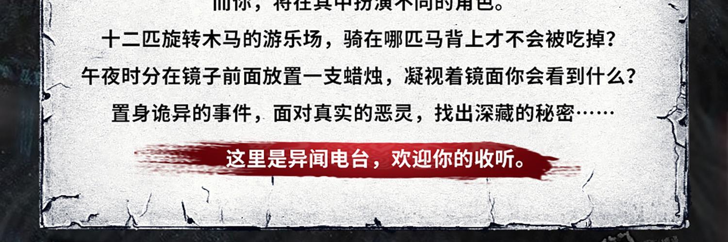 隐藏在现世之下的神秘电波,当它的声音在你耳旁响起,未知的恐怖也会随之降临。 这里的每一个故事,都将打开一个光怪陆离的世界,而你,将在其中扮演不同的角色。 十二匹旋转木马的游乐场,骑在哪匹马背上才不会被吃掉? 午夜时分在镜子前面放置一支蜡烛,凝视着镜面你会看到什么? 置身诡异的事件,面对真实的恶灵,找出深藏的秘密…… 这里是异闻电波,欢迎你的收听。