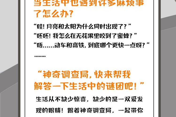 "当生活中也遇到许多麻烦事了怎么办?“哇!月亮和太阳为什么同时出现了?”“呸呸!我怎么在无花果里咬到了蜜蜂?”“唔……动车和高铁,到底哪个更快一点呀?”——“神奇调查局,快来帮我解答一下生活中的谜团吧!”生活从不缺少惊喜,缺少的是一双爱发现的眼睛!跟着神奇调查局,一起带你解密生活中的各种谜题~还等什么?冒险之旅,就在你身边!立即启程!和牛局长、友友开启一场冒险、欢笑的生活旅程吧!"
