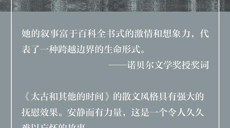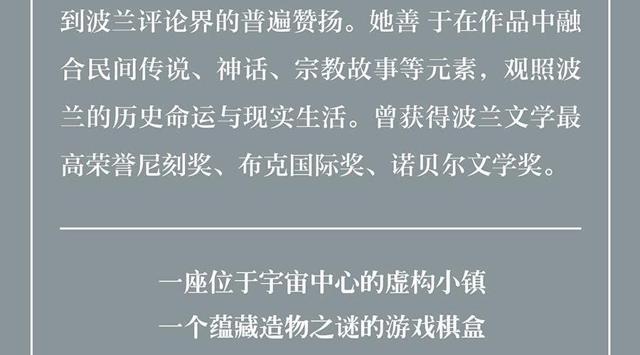 2018年诺贝尔文学奖获奖者、、波兰文学女王奥尔加·托卡尔丘克成名作。2019年度十大文学好书之一,八十四块时间的裂片,拼贴出历史的斑斓大梦。 小说共84个章节,每一个章节以“xxx的时间”命名,通过不同的视角讲述了太古之中各种人物,甚至动物、植物和东西的故事:触摸世界边界的少女、沉迷解谜游戏的地主、寂寞的家庭主妇、咒骂月亮的老太婆,乃至天使、水鬼、哈巴狗、菌丝、小咖啡磨……以三代人的人生故事,折射了波兰二十世纪动荡起伏的历史命运。 太古是一个地方,位于宇宙的中心。它的四个边界由四位天使守护。太古之外的世界并不存在,自以为走出太古的人,其实站在边界上做梦,梦见自己走到了外面的世界。等他们苏醒过来,便回家去,把自己的梦当成了回忆。边界也会生出现成的人,如同他们从外面的世界而来……