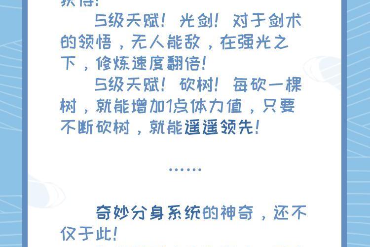 这是一个危险的世界,灵气复苏,妖物横行! 上一世的鼠玉白,是一名超凡者,实力不济,最终目睹世界被可恶的妖神吞噬,天地崩塌,世界毁灭! “这一次,我要阻止妖神,拯救世界!” 幸好,有妙用无穷的奇妙分身系统在身,他可以快人一步,提升实力! 为了不让悲剧重演,鼠玉白更加努力,培养了一个又一个的高级分身! 一个又一个S级天赋,纷纷获得! S级天赋!光剑!对于剑术的领悟,无人能敌,在强光之下,修炼速度翻倍! S级天赋!砍树!每砍一棵树,就能增加1点体力值,只要不断砍树,就能遥遥领先! …… 奇妙分身系统的神奇,还不仅于此! 每当鼠玉白修为突破,召唤的分身就能翻倍! 突破到一阶超凡者,鼠玉白每天就能召唤2个分身! 二阶4个,三阶8个,四阶16个,五阶32个,六阶64个,七阶128个,八阶256个,九阶512个! 那一日,妖神降临世间。 却见天穹之上,漫天彻地!逾千越万个身影! “你终于来了!妖神是吧?入侵世界是吧?我等这一天,已经太久太久了!” 少年微微一笑,号令亿万分身,一拥而上!打爆妖神!