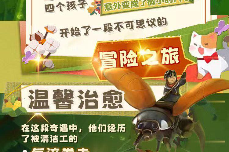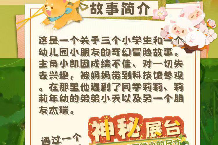 这是一个关于三个小学生和一个幼儿园小朋友的奇幻冒险故事。主角小凯因成绩不佳、对一切失去兴趣,被妈妈带到科技馆参观。在那里他遇到了同学莉莉、莉莉年幼的弟弟小天以及另一个朋友杰瑞。通过一个神秘展台,四个孩子意外变成了微小的尺寸,开始了一段不可思议的冒险之旅。