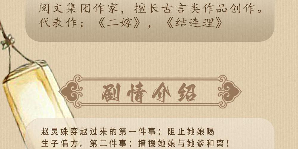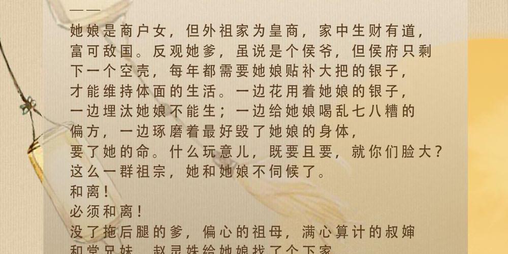 赵灵姝穿越过来的第一件事:阻止她娘喝生子偏方。 第二件事:撺掇她娘与她爹和离! 她娘是商户女,但外祖家为皇商,家中生财有道,富可敌国。 反观她爹,虽说是个侯爷,但侯府只剩下一个空壳,每年都需要她娘贴补大把的银子,才能维持体面的生活。 一边花用着她娘的银子,一边埋汰她娘不能生;一边给她娘喝乱七八糟的偏方,一边琢磨着最好毁了她娘的身体,要了她的命。 什么玩意儿,既要且要,就你们脸大? 这么一群祖宗,她和她娘不伺候了。 和离! 必须和离! 没了拖后腿的爹,偏心的祖母,满心算计的叔婶和堂兄妹,赵灵姝给她娘找了个下家,母亲一年抱俩,三年抱三。 她也给自己谋了个好姻缘,成功嫁到皇室去,成了帝王家的儿媳妇—— 秦王正妃,夫君专宠,赵灵姝每天做梦都能笑醒。