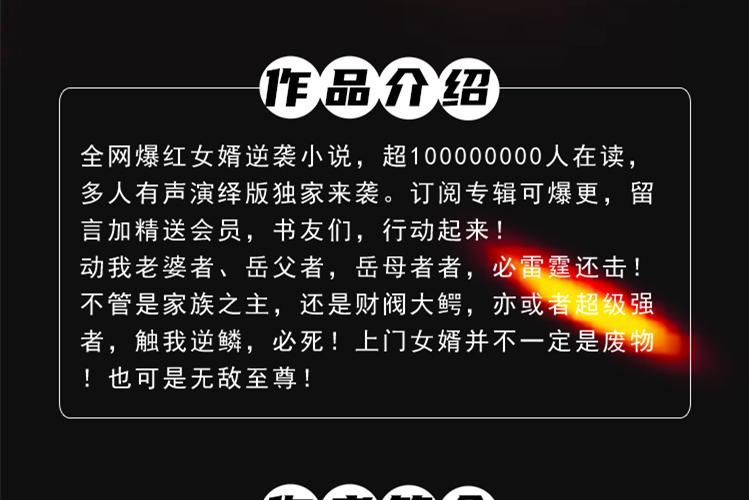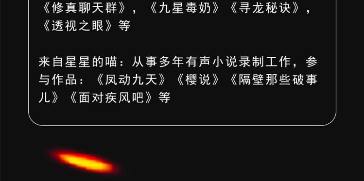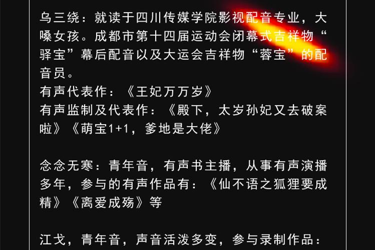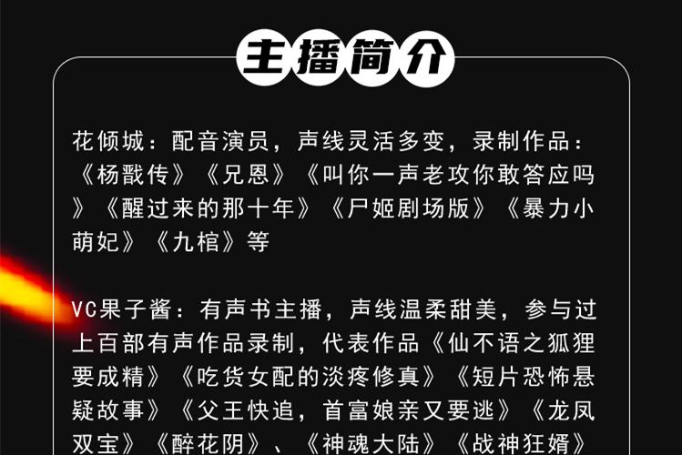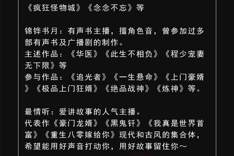 "花倾城:配音演员,声线灵活多变,录制作品:《杨戬传》、《兄恩》、《叫你一声老攻你 敢答应吗》、《醒过来的那十年》、《尸姬剧场版》、《暴力小萌妃》、《九棺》等 VC果子酱:有声书主播,声线温柔甜美,参与过上百部有声作品录制,代表作品《仙不语 之狐狸要成精》、《吃货女配的淡疼修真》、《短片恐怖悬疑故事》、《父王快追,首富娘 亲又要逃》、《龙凤双宝》、《醉花阴》、《神魂大陆》、《战神狂婿》、《疯狂怪物城》、 《念念不忘》等 锦铧书月:有声书主播,擅角色音,曾参加过多部有声书及广播剧的制作。主述作品:《华 医》、《此生不相负》、《程少宠妻无下限》等 参与作品:《追光者》、《一生悬命》、《上门豪婿》、《极品上门狂婿》、《绝品战神》、 《炼神》等。 最情听:爱讲故事的人气主播。代表作《豪门龙婿》、《黑鬼钎》、《我真是世界首富》、 《重生八零嫁给你》现代和古风的集合体,希望能用好声音打动你,用好故事留住你~ "