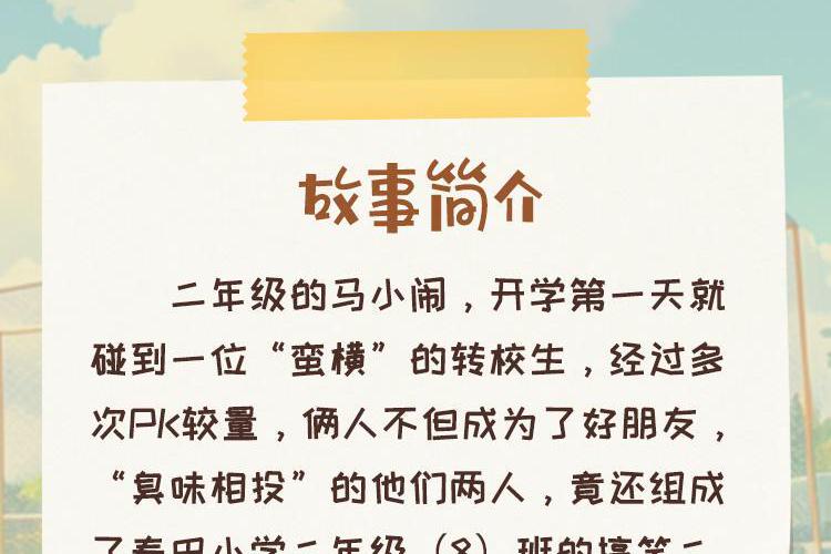二年级的马小闹,开学第一天就碰到一位“蛮横无礼”的转校生,经过多次PK较量,俩人不但成为了好朋友,“臭味相投”的他们两人,竟然还组成了二年级(8)班的搞笑二人组,给班级带来了无数欢声笑语…