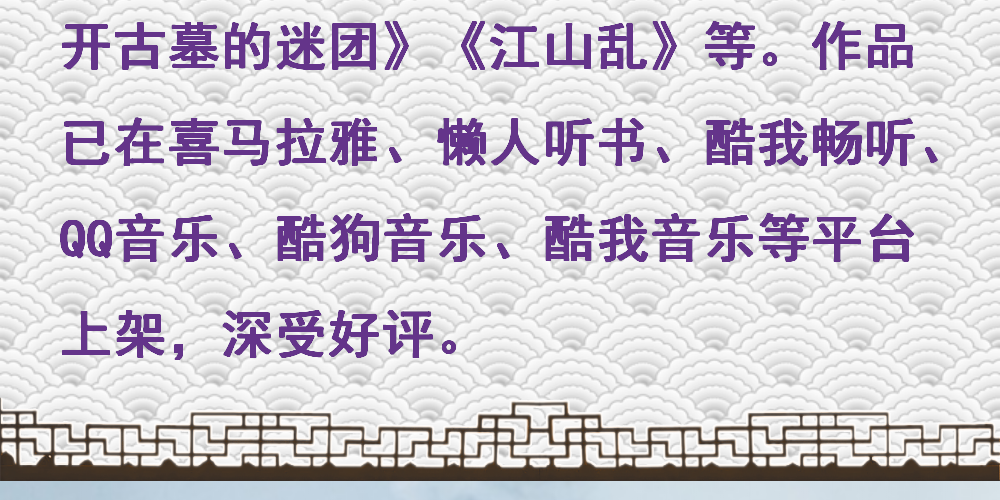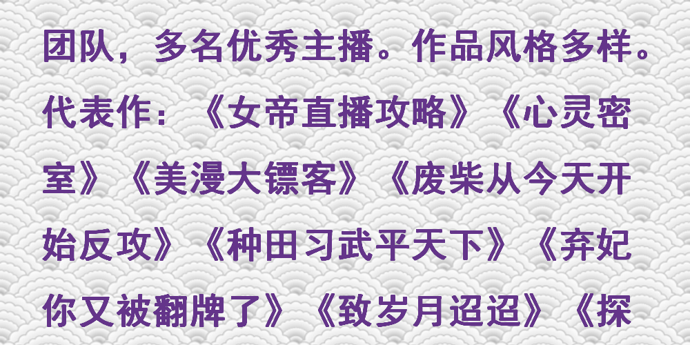 烹小鲜儿戏剧社为tme旗下知名剧社,作品在各平台上架20余部。作品风格多样:《女帝直播攻略》《心灵密室》《废柴从今天开始反攻》《种田习武平天下》《美漫大镖客》《弃妃你又被翻牌了》《致岁月迢迢》等深受听众喜欢。欢迎喜欢有声演播的朋友加入团队。