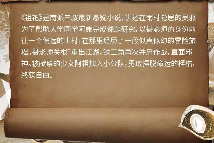 周建龙演播,南派三叔著作《祖祀》 《祖祀》是南派三叔最新悬疑小说,讲述在雨村隐居的吴邪,为了帮助大学同学阿康完成课题研究,以摄影师的身份前往一个偏远的山村,在那里经历了一段似真似幻的冒险旅程。“摄影师关根”重出江湖,铁三角再次并肩作战,直面邪神。被献祭的少女阿祖加入小分队,勇敢摆脱命运的桎梏,终获自由。