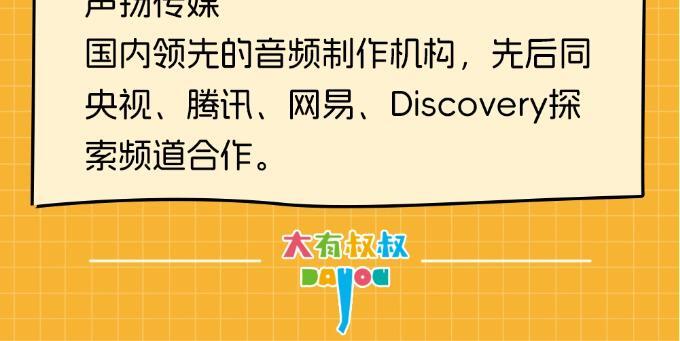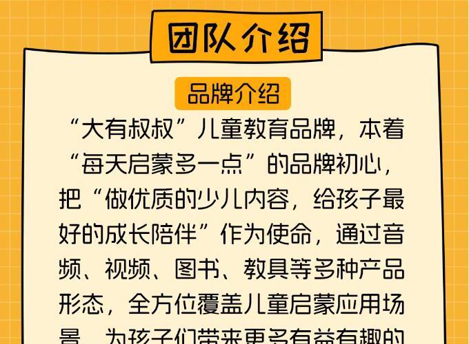 大有叔叔以“做优质少儿内容,给孩子最好的成长陪伴”作为使命。聚焦儿童,以有声为起点,通过音视频、图书、玩教具等多种内容形态,输出符合儿童心理成长规律的产品体系,全方位覆盖家庭消费场景!