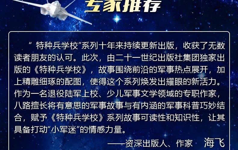 作家八路,军事学学士,教育学硕士,少儿军事文学领军人物,以“学会生存”的理念进行创作,将“知识、技能、品质”三大要素融入到作品之中。曾获军队科技进步二等奖等多项奖励,作品入选“十三五”国家重点出版物出版规划,作品有“特种兵学校”“少年特战队”“会飞的军校”“烈火兵王”等。