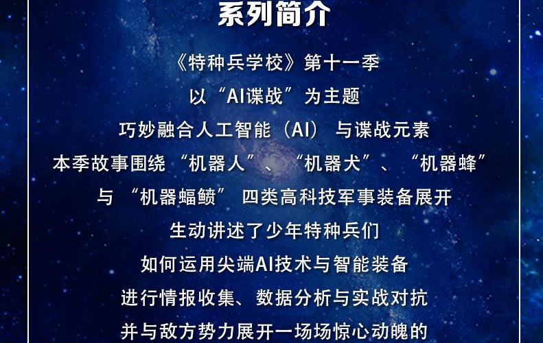 《特种兵学校》第十一季" AI 谍战"系列广播剧 燃爆上线! 铁血铸魂,声动战场!集结号已吹响!你准备好了吗? 少年特种兵们携《特种兵学校》第十一季重磅回归! 这一次,他们将面临前所未有的终极考验! 荒岛绝境、神秘组织、高科技对抗——危机指数MAX! 张教官的终极特训是否能造就真正的“兵王”? 数次秘密行动究竟隐藏着什么? 沉浸式战场体验,全程高能! 声效升级!枪械轰鸣、战术协同、极限生存,身临其境! 配音走心! 熟悉的声音再聚首,再现少年担当与热血情谊! 全新剧情!揭开前季伏笔,开启更大谜团与更燃征程!