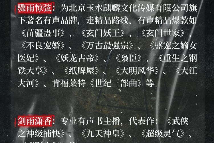 骤雨惊弦:为北京玉水麒麟文化传媒有限公司旗下著名有声品牌,走精品路线,有声精品爆款如《苗疆蛊事》、《玄门妖王》、《玄门世家》、《不良宠婚》、《万古最强宗》、《盛宠之嫡女医妃》、《妖龙古帝》、《枭臣》、《重生之钢铁大亨》、《纸牌屋》、《大明风华》、《大江大河》、肯福莱特《世纪三部曲》等。 剑雨潇香:专业有声书主播,代表作:《武侠之神级捕快》、《九天神皇》、《超级灵气》、《邪影本纪》等。