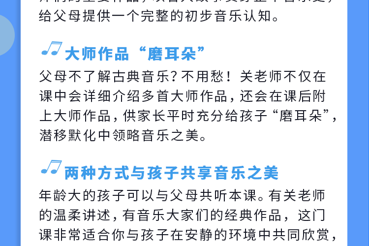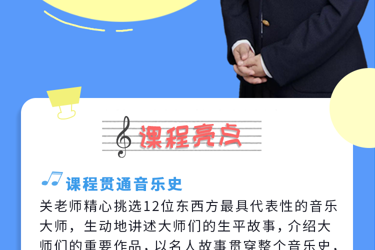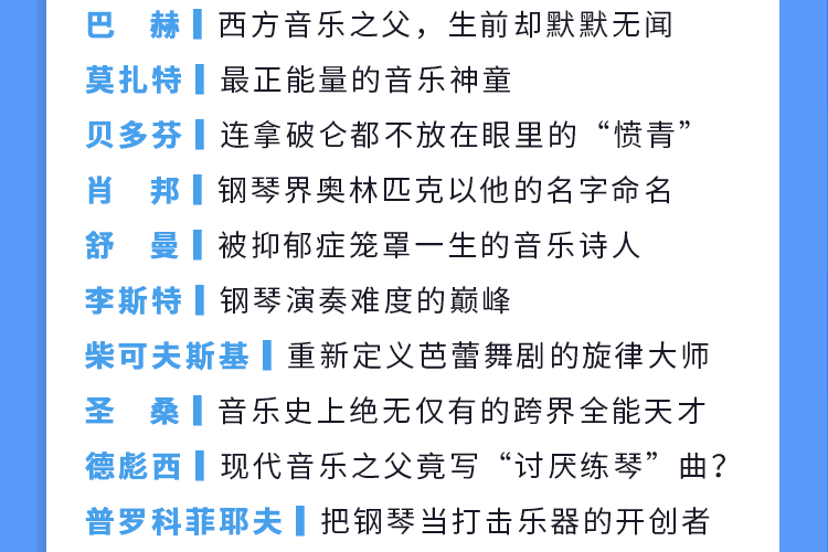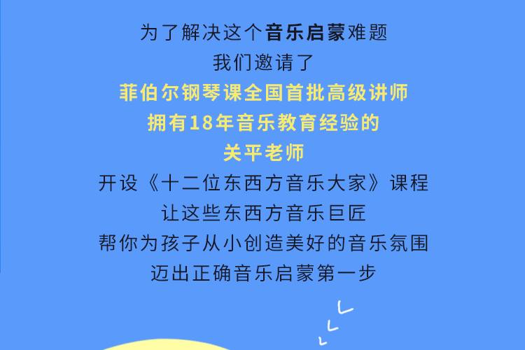 菲伯尔钢琴名师关平老师,将用26节极具欣赏价值的音频课,为你介绍中西方从古至今12位极富盛名的音乐巨匠。实为每个希望孩子学习音乐,爱上音乐的家庭必备的亲子音乐启蒙课程。从小为孩子营造音乐氛围,熟悉名家名作,音乐之路就此开启。