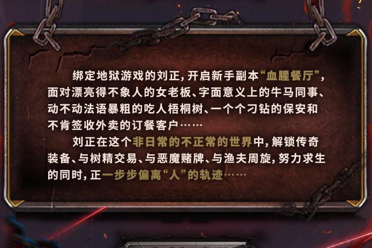 绑定地狱游戏的刘正,开启新手副本“血腥餐厅”,面对漂亮得不象人的女老板、字面意义上的牛马同事、动不动法语暴粗的吃人梧桐树、一个个刁钻的保安和不肯签收外卖的订餐客户……刘正在这个非日常的不正常的世界中,解锁传奇装备、与树精交易、与恶魔赌牌、与渔夫周旋,努力求生的同时,正一步步偏离“人”的轨