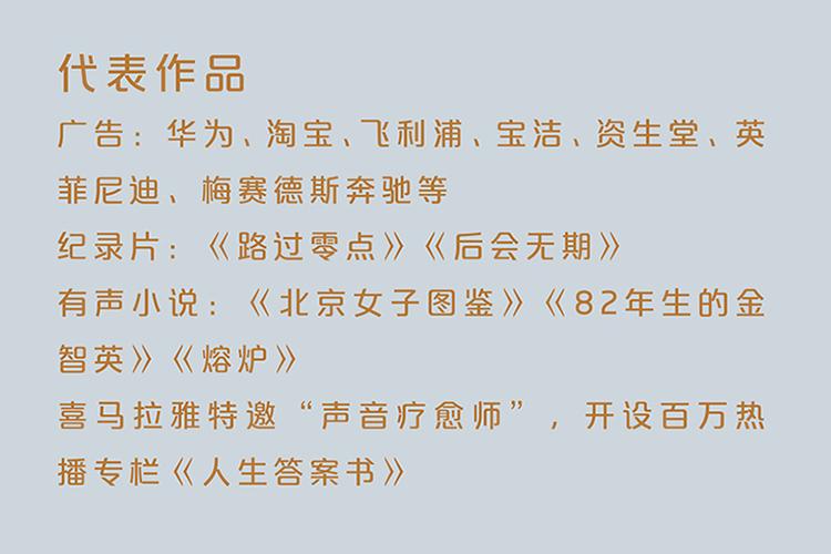 知名配音员,自媒体“晨曦八点半”创始人。 音色极具辨识度,诉说感深入人心 代表作品:淘宝、华为、奔驰、宝洁等品牌TVC广告;湖南卫视《路过零点》《后会有期》纪录片;电影《老师·好》《烈火英雄》预告片等;并为央视、央广、湖南卫视、东南卫视、河北卫视等媒体录制广告、宣传、片花百余支。