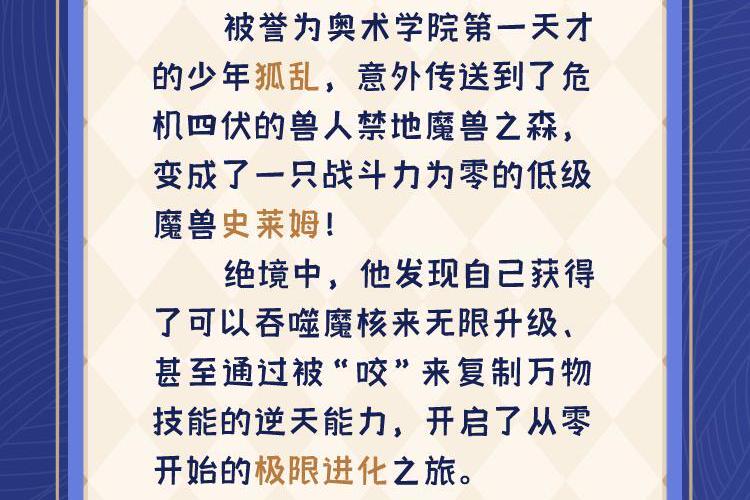 被誉为奥术学院第一天才的少年狐乱,意外传送到了危机四伏的兽人禁地魔兽之森,变成了一只战斗力为零的低级魔兽史莱姆! 绝境中,他发现自己获得了可以吞噬魔核来无限升级、甚至通过被“咬”来复制万物技能的逆天能力,开启了从零开始的极限进化之旅。 为了生存并找到回家的路,狐乱与自称战争之神却胆小怕事的阿拉斯加、嗜睡贪吃但一巴掌能拍飞巨石的猫琪琪结成同伴,向着魔兽之森更深处勇敢前进,寻找传说中可前往任意时空的“天启之门”……