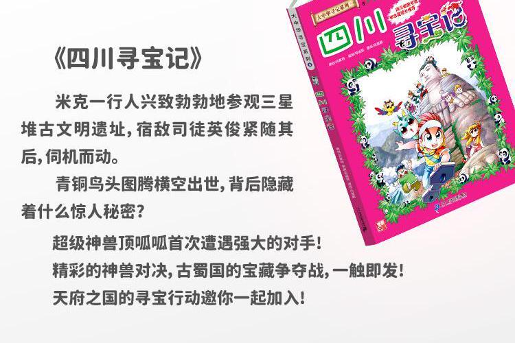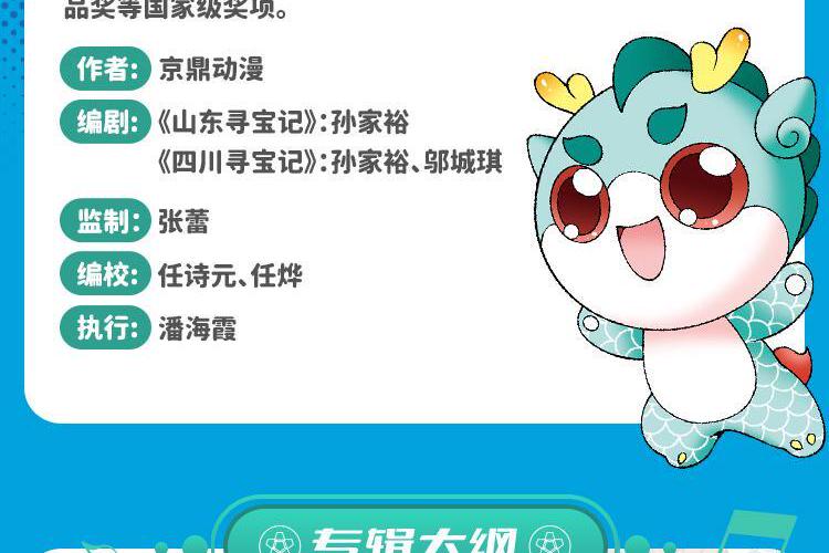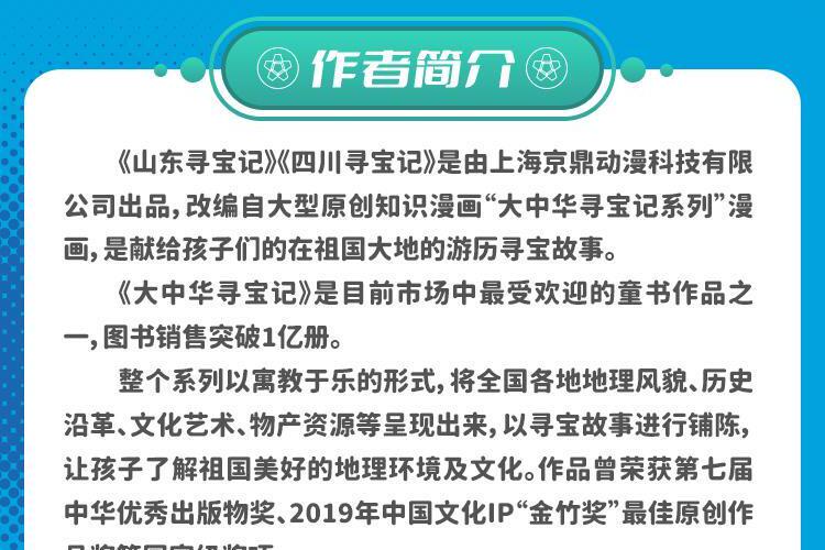 《山东、四川寻宝记》是由上海京鼎动漫科技有限公司出品,改编自大型原创知识漫画“大中华寻宝记系列”漫画,是献给孩子们的在祖国大地的游历寻宝故事。 《大中华寻宝记》是目前市场中最受欢迎的童书作品之一,图书销售突破8800万册。 整个系列以寓教于乐的形式,将全国各地地理风貌、历史沿革、文化艺术、物产资源等呈现出来,以寻宝故事进行铺陈,让孩子了解祖国美好的地理环境及文化。作品曾荣获第七届中华优秀出版物奖、2019年中国文化IP“金竹奖”最佳原创作品奖等国家级奖项。